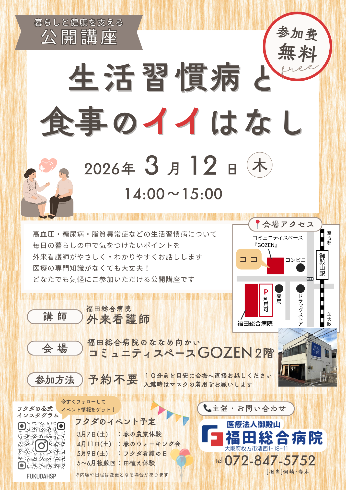 内容:高血圧・糖尿病・脂質異常症などの身近な病気について看護師がわかりやすく解説します。